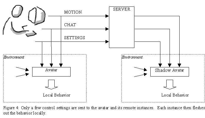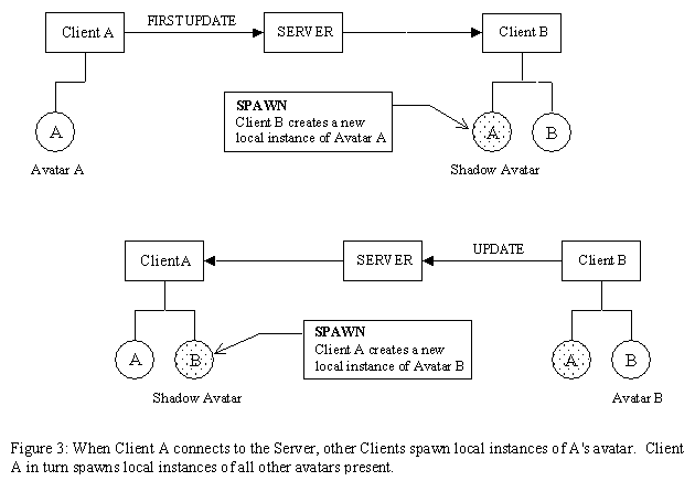 The Server acts as a simple router between the Clients. When a message is sent to the Server, it gets routed to all other connected Clients. The Server gives each Client a unique ID number when they connect. If a Client receives a message from another Client it has not heard from before, it will assume this is a new user, and will spawn a new avatar representing that user. It then sends an update message of its own, to elicit the same creation procedure in the new Client (see Figure 3). The term Shadow Avatar is used here to refer to the avatars in a Client that represent other users, in contrast with the one avatar that represents the user of that particular Client (a users can elect to see their own representation by selecting the appropriate camera angle).