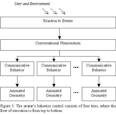 The avatars in BodyChat react to an event by selecting the appropriate Conversational Phenomenon that describes the new state, initiating the execution of associated Communicative Behaviors. Essentially the avatars behavior control consists of four tiers, where the flow of execution is from top to bottom (see Figure 5).