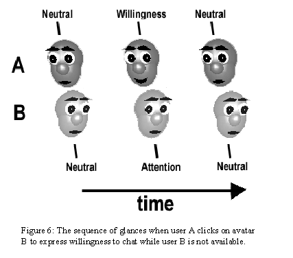 User A is walking around, seeking out someone interested in chatting. After awhile A spots a lone figure that is apparently not occupied. A clicks on the other avatar, expressing Willingness To Chat (see 4.3). The other Avatar reacts with a brief glance without a change in expression. This lack of sustained attention signals to A that the other user is not Available (see 4.3). The automated sequence of glances is shown on figure 6.
