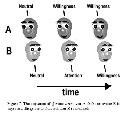 User A continues to walk about looking for a person to chat with. Soon A notices another lone figure and decides to repeat the attempt. This time around the expression received is an inviting one, indicating that the other user is Available. The automated sequence of glances can be seen in figure 7.