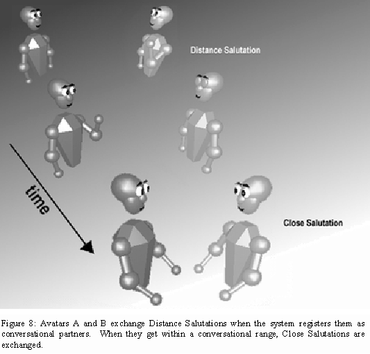 Immediately after this expression of mutual openness, both avatars automatically exchange Distance Salutations to confirm that the system now considers A and B to be conversational partners. Close Salutations are automatically exchanged as A comes within Bs conversational range. Figure 8 shows the sequence of salutations.
