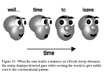 During a conversation, a user can indicate willingness to Break Away. The user informs the system of his or her intention to Break Away by placing a special symbol (a forward slash) into a chat string. This is elicits the appropriate diverted gaze, giving the partner a visual cue along with the words spoken. For example, when ready to leave Paul types "/well, I have to go back to work". The partner will then see Pauls avatar glance around while displaying the words (without the slash). If the partner replies with a Break Away sentence, the conversation is broken with a mutual farewell. If the partner replies with a normal sentence, the Break Away is cancelled and the conversation continues. Only when both partners produce subsequent Break Away sentences, is the conversation broken (Kendon 1990, Schegloff and Sacks 1973).
