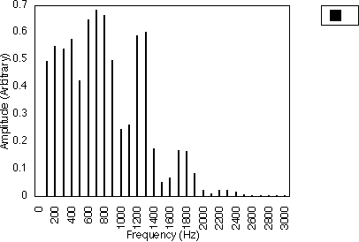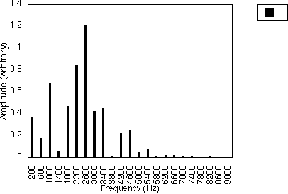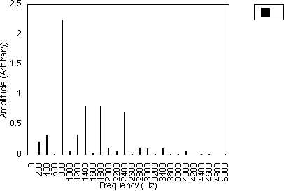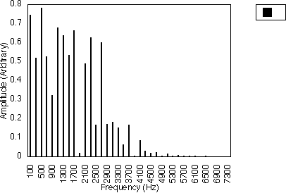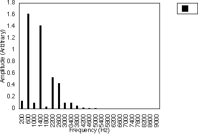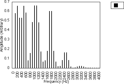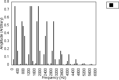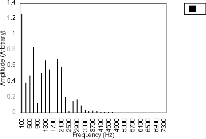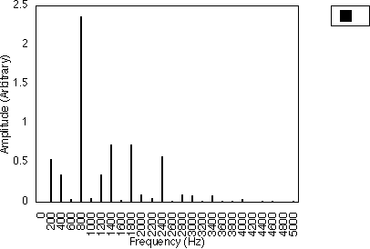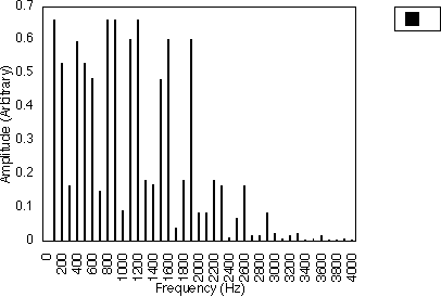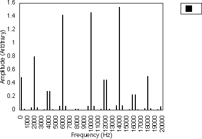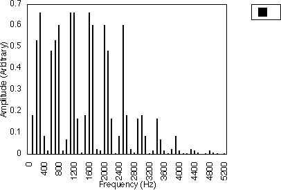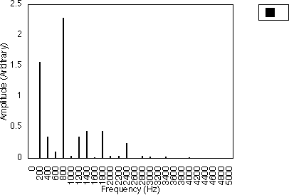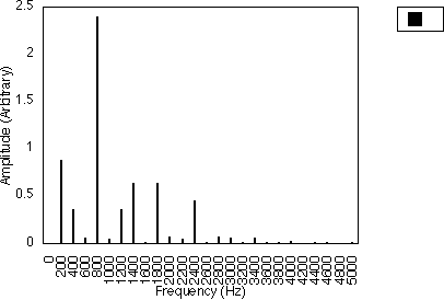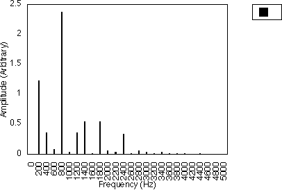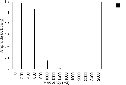 Figures 5.10, 5.11 and 5.12 give examples for f1 = 200 Hz and N1 = 2, for N2 = 3, 5 and 7 respectively i.e. f1 = 300, 500 and 700 Hz. In all three cases, the spacing between harmonics is 200 / 2 i.e. 100 Hz. However, the relative amplitudes of the harmonics varies with the value of N2 and hence f2 . It may be observed from figures 5.10, 5.11 and 5.12 that many of the harmonics are diminished in amplitude for higher values of N2. The generated harmonics for these three cases are 0 Hz, 100 Hz, 200 Hz, 300 Hz ....
