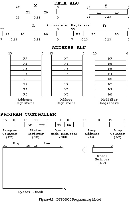 There are six data ALU accumulator registers : A2, A1, A0, B2, B1 and B0. They may also be combined to form two general purpose 56-bit accumulators, A and B. These accumulators are used for arithmetic calculations and data manipulation.