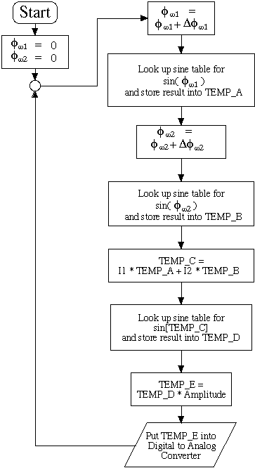 In the next step [phi][omega]m1 is incremented by adding [Delta][phi][omega]m1. This is made the argument for the sine function and a sine table look up is done with the result, i.e. sin([omega]m1t), stored in a temporary buffer TEMP_A. [phi][omega]m2 is then also incremented and similarly becomes an argument for another sine function. The sine table look up result for [phi][omega]m2 is then placed in a second buffer TEMP_B.