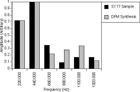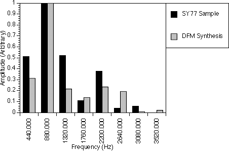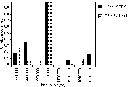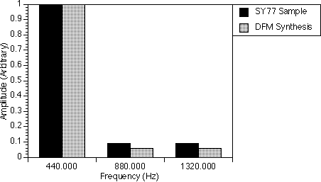 The soft saxophone A2 note spectrum in figure 9.2 was generated with fm1 and fm2 set to 440.0 Hz and 880.0 Hz respectively. The indices were set to 1.2 for modulator 1 and to 2.0 for modulator 2. With these settings, we were able to generate the second, fourth harmonics quite accurately. For the first, third and fifth harmonics, we could able to achieve about half the amplitudes of the sample. With only one DFM operator, we can therefore achieve quite a good match to the spectrum of the real instrument. With a second DFM operator, we believe we could enhance the 440.0 Hz, 1320.0 Hz and 2200.0 Hz frequency components and diminish the 2640.0 Hz frequency component such that the resulting spectrum should match that of the real sample closely.