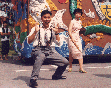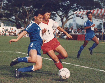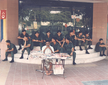 Soldiers taking a break behind a newspaper stand during the Singapore National Day Parade