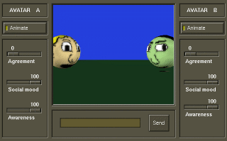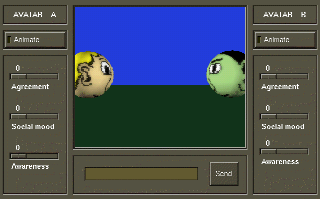 SLIDERS: The sliders represent agreement, social mood and awareness. The agreement slider controls the amount of positive visual backchannel feedback to the speaker, realized here as head nods (that's their only bodypart anyway!). The social mood controls the change in their stance (rotation of head) as you approach the conversation. The more social they are, the more they turn towards you and give you a friendly gaze. The awarness slider changes their definition of a proximity zone, i.e. how close you have to get before certain social actions are taken. | |