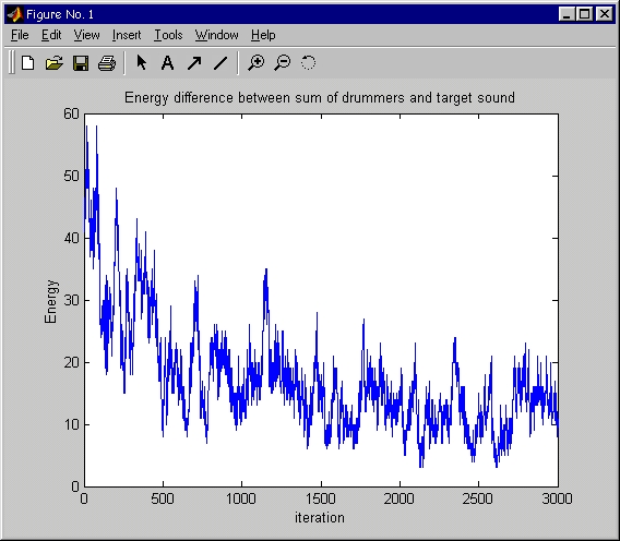 The last few iterations were played in real-time (along with the target). The resulting sum of the five drummers seemed to be converging to the target pattern.