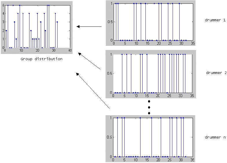 What was of interest in this case was how drummers might independently alter their own beat to 'fit in' to the overall sound of the group, independent of each other. This method tells us nothing about how drummers interact; however, it is interesting to see that drummers can eventually choose their own pattern to fit an overall target.