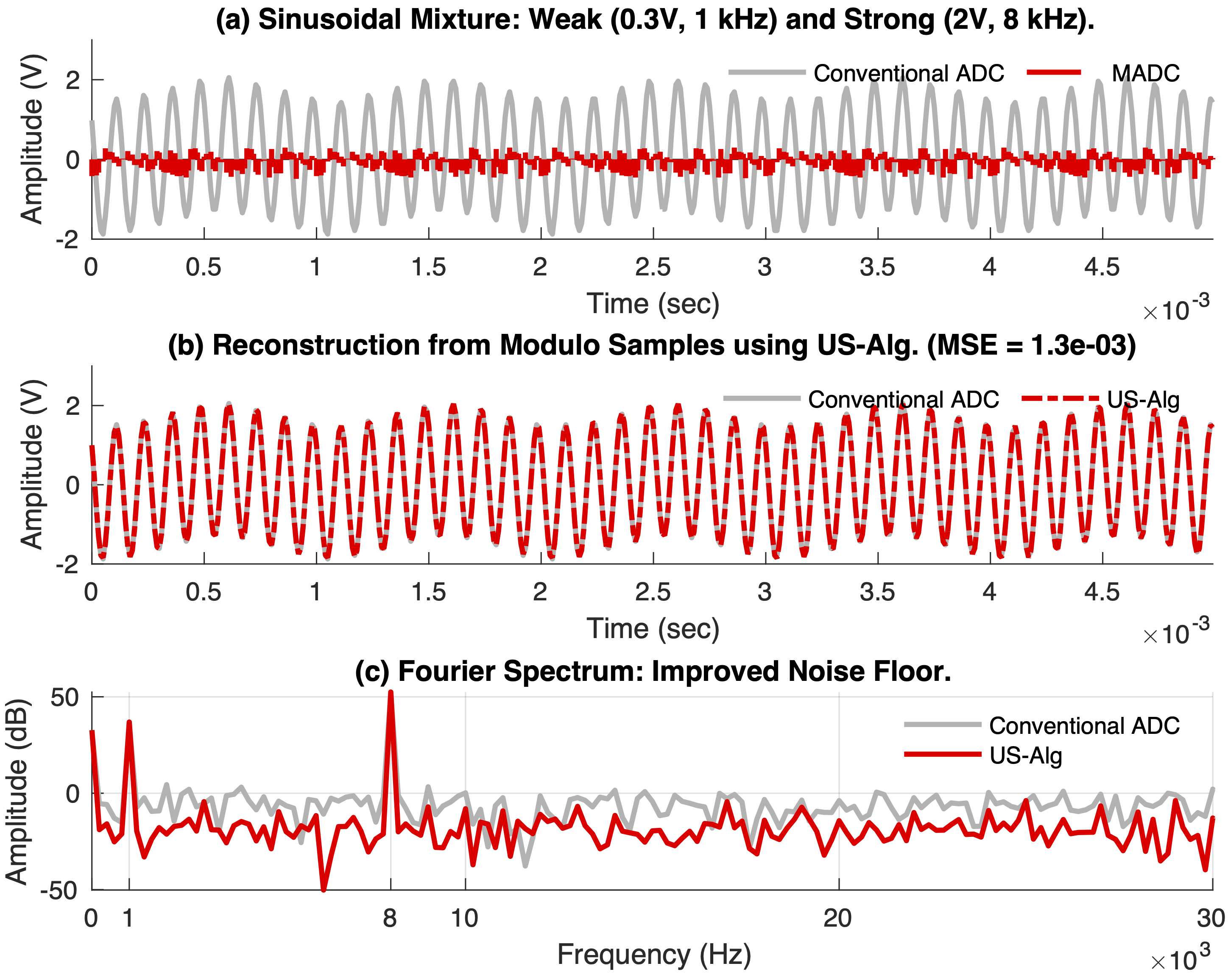 In this scenario, the MADC measurements (\(500\) samples) entails intensive modulo-folds (degrees-of-freedom of \(\varepsilon\)\(=330\)). Despite these challenging settings, we use the US-ALG for reconstruction with fourth-order difference or \(N=4\), achieving an signal recovery with a mean-squared error \(\propto 10^{-3}\).