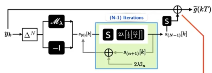 To estimate \(e[k]\) from \(y[k]\) we assume a smoothness property on \(g(t_k)\), i.e. \(||\Delta^N g(t_k) ||_\infty < \frac{\lambda_h}{2 N}\).