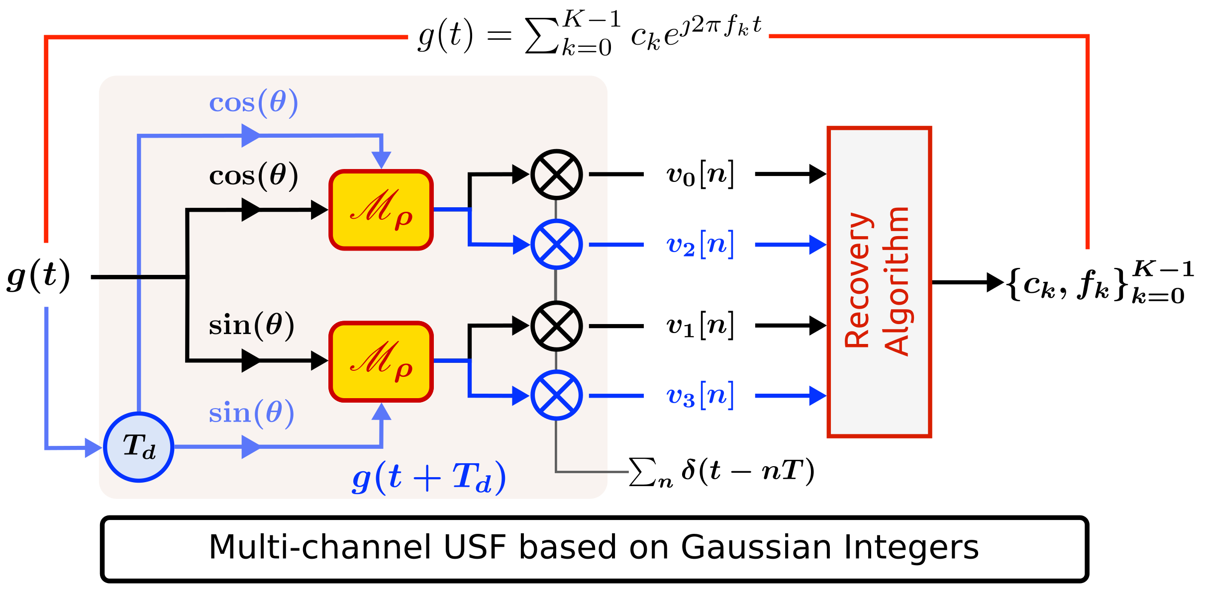 where signal parameters \(\{ f_k, c_k \}_{k=0}^{K-1}\) are unknown. \(g(t)\) is acquired using the multi-channel