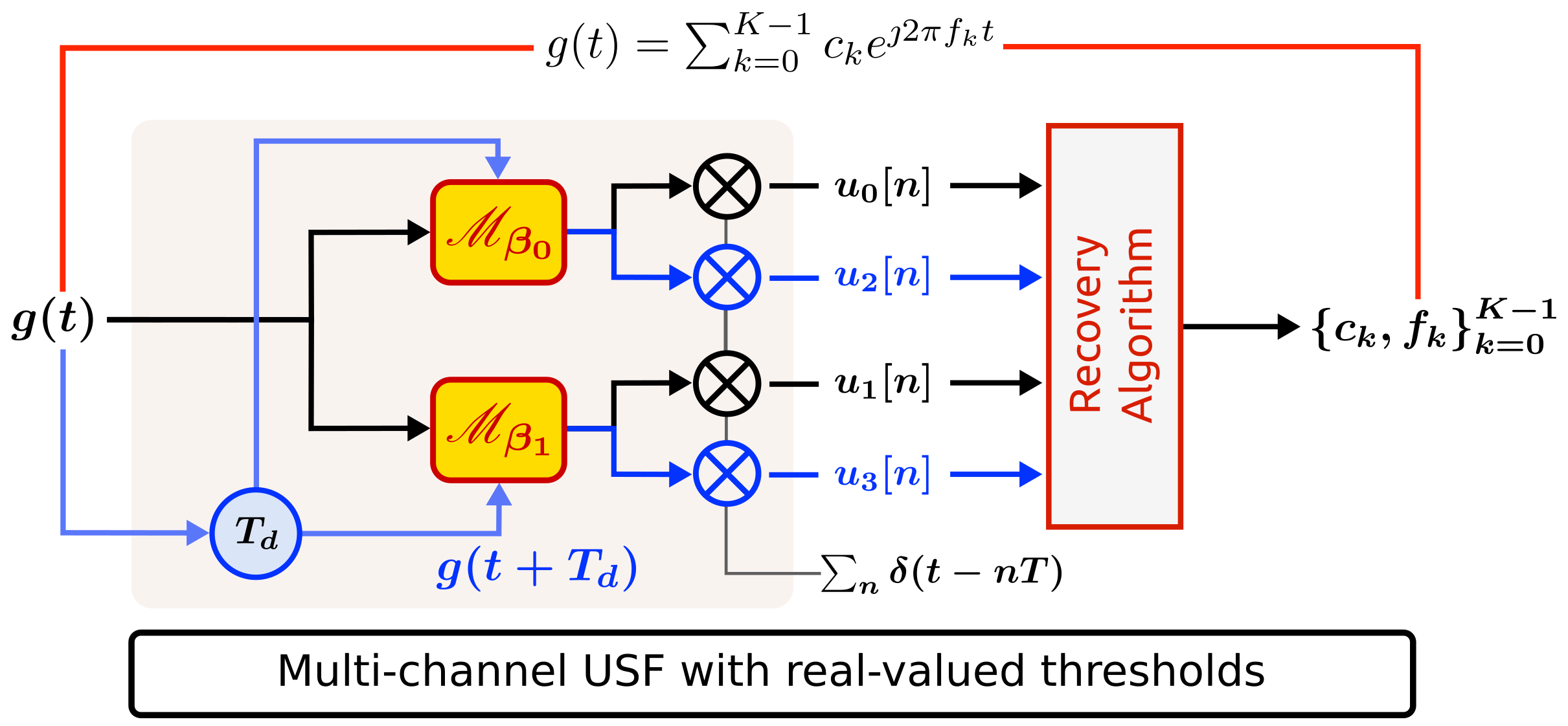 Given measurements \(\{ u_l[n] \}_{l=0}^{3}\) captured by the architecture in Fig. 24 with thresholds \(\beta_0\) and \(\beta_1\). Then, \(g(t)\) can be exactly recovered with \(N_{i} \geqslant \left ( 2 - \lfloor \frac{i}{2} \rfloor \right ) K, i\in \mathbb{I}_{4}\) samples provided that \(T_d \leqslant \frac{\pi}{\mathsf{max}_k |\omega_k|}\) and \(\left\| g(t) \right |_{\infty} < \epsilon \frac{\mathsf{c_0, c_1}}{2}\).