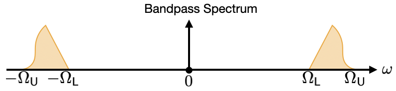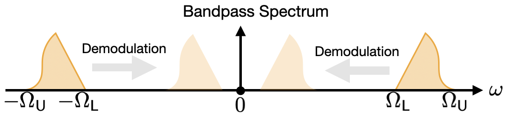 To formalize the above, we let \(g[k]\) represent the samples of a bandlimited signal \(g(t)\), that are generated by applying a lowpass filter with bandwidth s to the samples of a bandpass signal \(g_\mathsf{BP}(t)\).