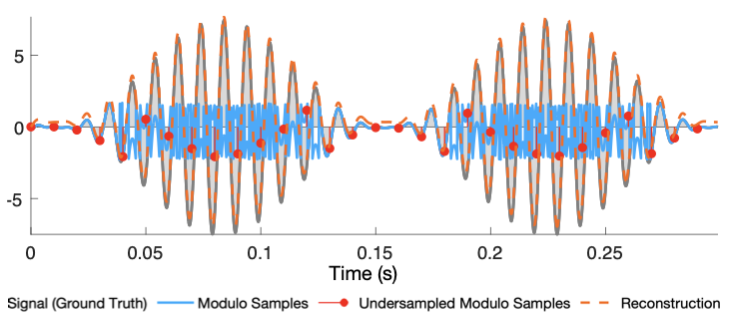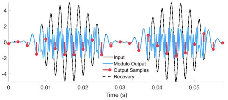 As this is computational sensing architecture, the modulo-ADC produces encoded samples of the signal to be recovered. Then, a decoding algorithm is needed to extract the desired information from the samples. More information about recovery algorithms is in the Algorithms section.