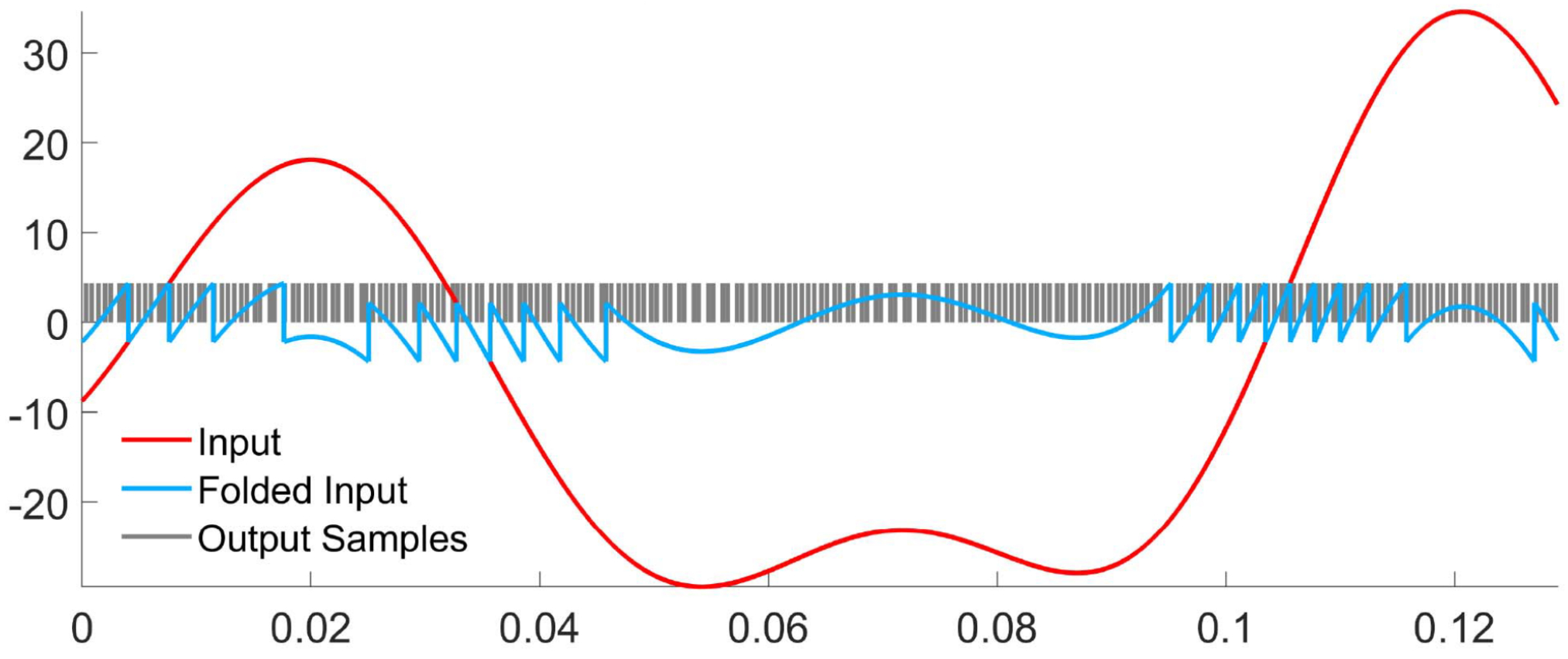 where \([f] = f - \lfloor f \rfloor\) defines the fractional part of \(f\) and \(\lambda > 0\) is the ADC threshold. The following input-output pairs illustrate modulo folding in action.