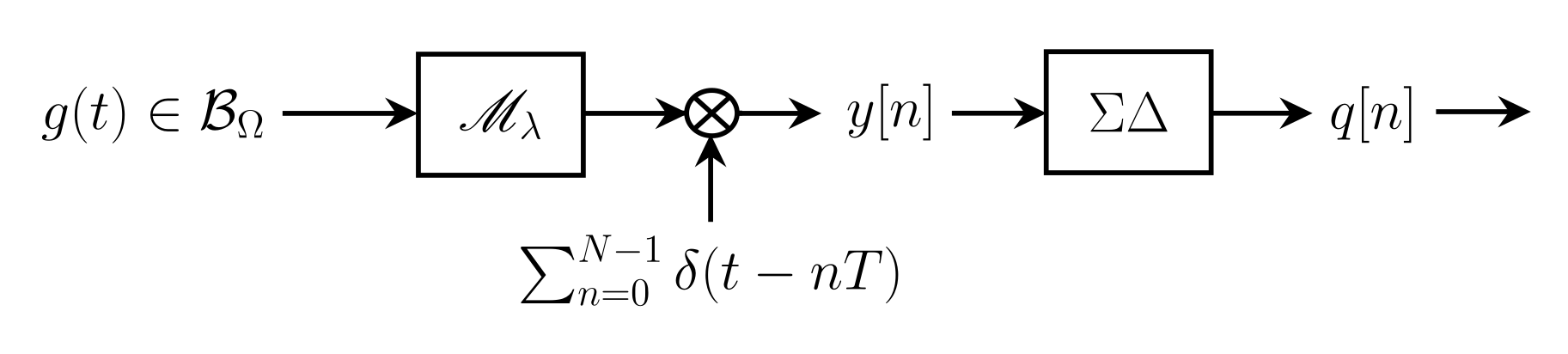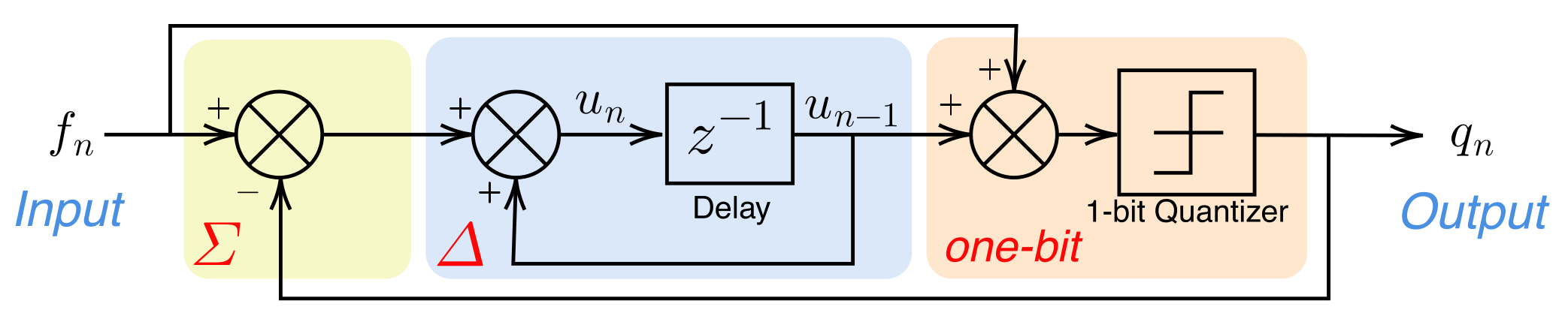 factor. One of the popular one-bit acquisition architecture is \(\Sigma\Delta\) Quantizer described by the following diagram.