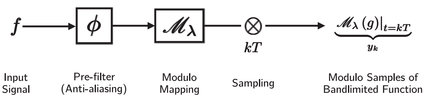 In fact, there is a one-to-one mapping between a bandlimited function and its modulo samples provides that the sampling rate is higher than the critical rate of the Nyquist rate, \(T<\pi / \Omega\). The Injectivity Conditions are proved in [2].