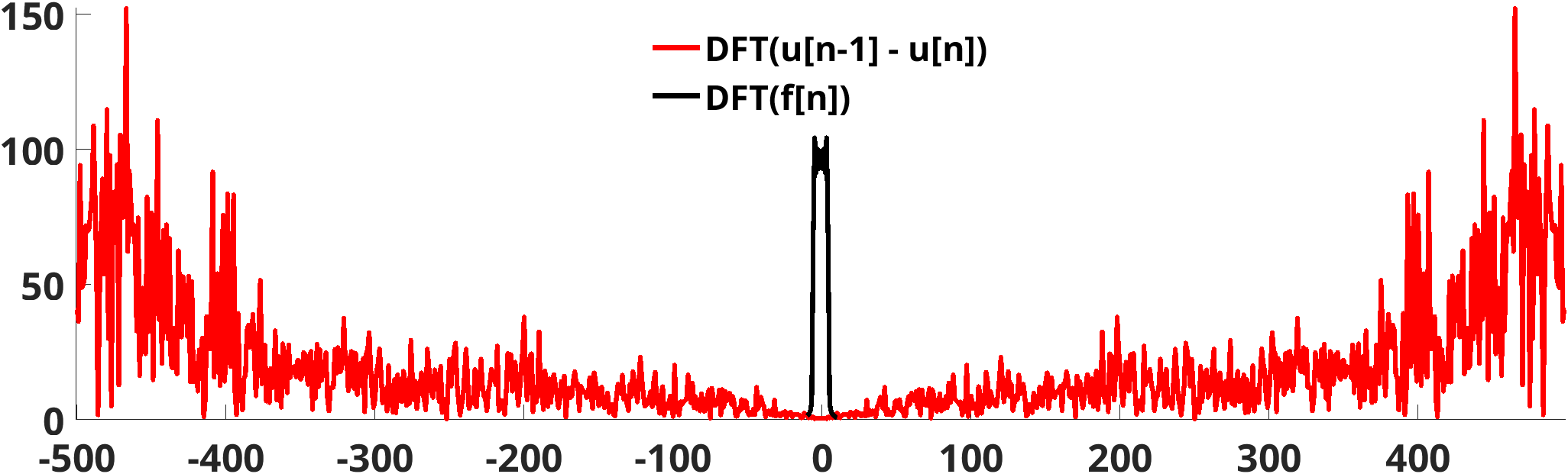 Note that due the presence of noise, it may happen that \(y_{\eta}[k] \not\in [-\lambda,\lambda]\). Nonetheless, for \(b_{0}\) below some fixed threshold, our recovery method provably recovers noisy bandlimited samples \(\gamma[k]\) from the associated noisy modulo samples \(y_{\eta}[k]\) up to an unknown additive constant, where the noise appearing in the recovered samples is in entry-wise agreement with the one affecting the modulo samples. That is, \(\widetilde \gamma \left[ k \right] = \gamma \left[ k \right] + \eta \left[ k \right] + 2m\lambda, m\in \mathbb{Z}\).
