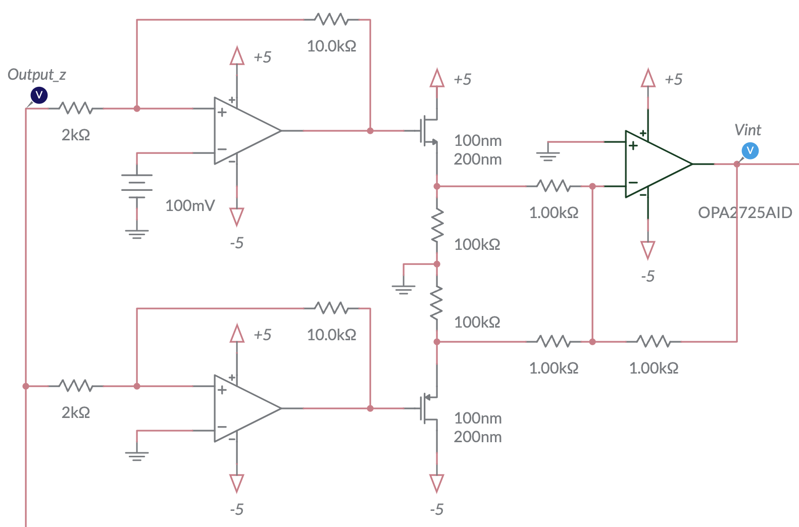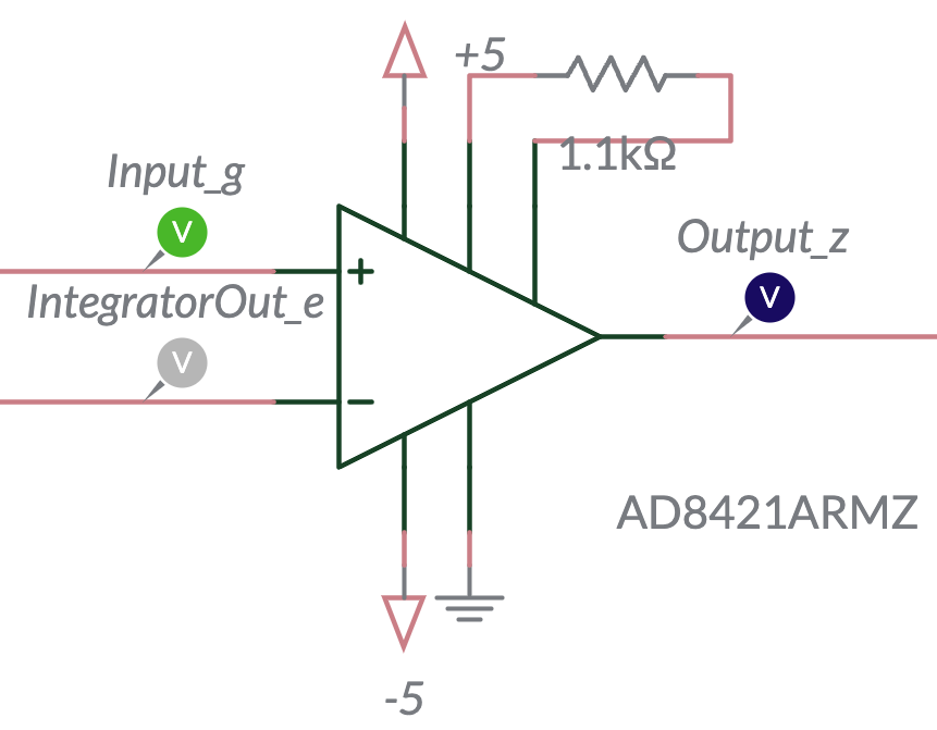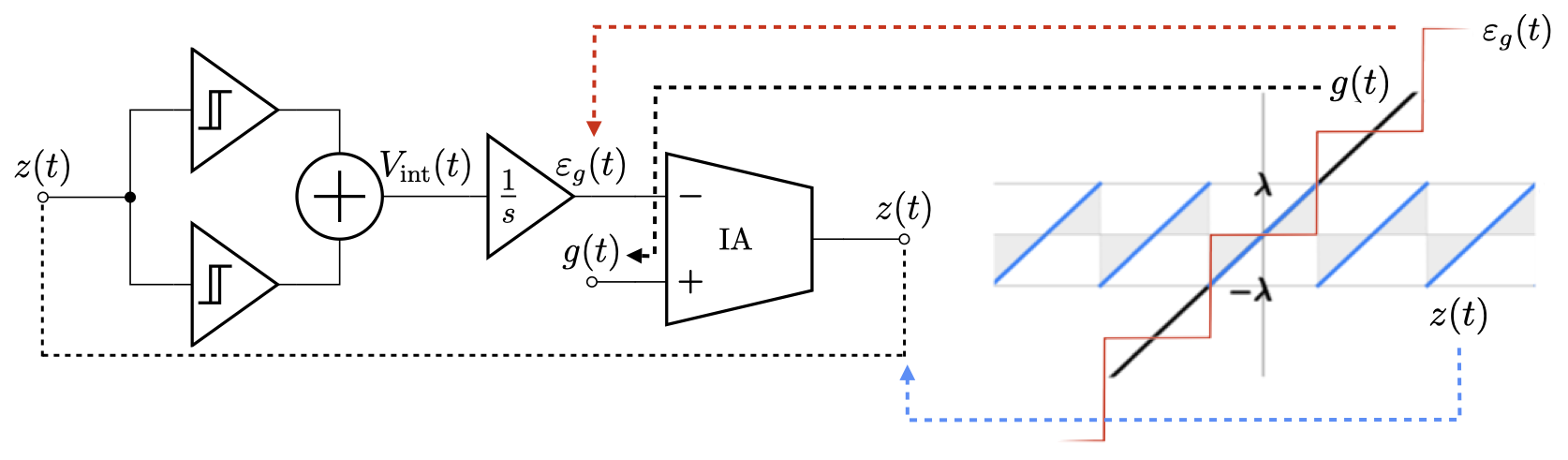 An auxiliary function \(\varepsilon_g(t)\) can be defined to help derive the modulo output \(z(t)\), as illustrated in the transfer diagram above. The subtraction can easily be carried out using an instrumentation amplifier (IA). Additionally, the adjustable gain of the IA provides a unique boost in performance to the system that will be explained later.