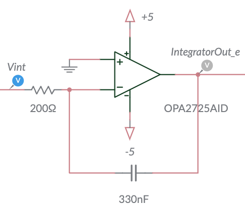 The auxiliary function \(\varepsilon_g(t)\) is generated by an integrator. The output of an operational amplifier (op-amp) integrator with an input signal \(V_{\texttt{int}}(t)\) is given by the following equation and is illustrated below.